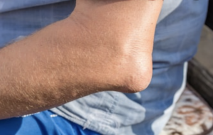 - Zwelling, roodheid en warmte aan de achterzijde van de elleboog.